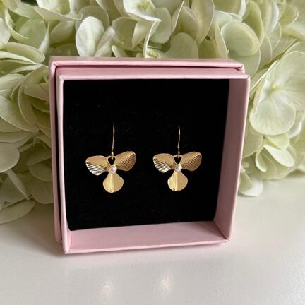 Smukkeste øreringe med blomster-look. Øreringene har en lille akrylperle i midten af blomsten, som giver en fin lille detalje.