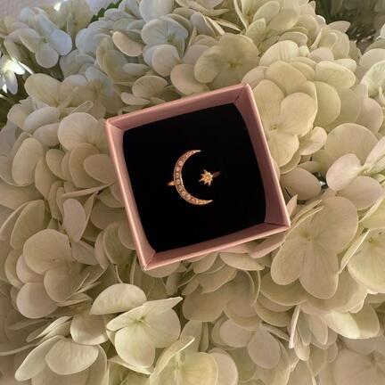 Ringen er lavet med en måne og stjerne, fyldt med de smukkeste sten, som skinner smukt i lyset.
